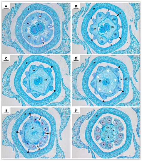 Transverse microtome sections through the gynostegium in a Ceropegia sandersonii flower bud in developmental phase P7. (A) Section showing three out of the five nectar cavities formed by interstaminal corona tissue; (B) section at level of the guide rails formed by anther flanks of two neighbouring stamens. Staminal corona tissue is formed on the dorsal side of stamens (black arrowheads); (C) section at level where staminal corona lobes (black arrowheads) separate from the stamen; (D) at level of the corpuscula, which are secreted by the translator glands (white arrowheads) of the style-head. The carpel apices are postgenitally fused; (E) at level of the pollinia (black asterisks; see also F) produced by the anthers; (F) at level of branched vascular bundles in the style-head (black arrowheads). The microtome sections were stained using Etzold’s solution. Abbreviations: c—carpel, cl—corpusculum, co—corona, g—guide rail, p—petals (fused), sh—style-head, st—stamen. Scale bars: 200 µm. Images by B.J.v.H.