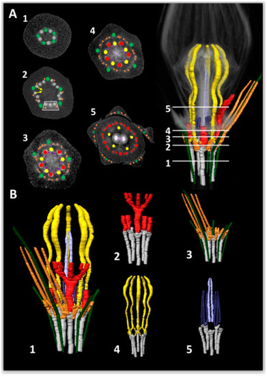 Reconstruction of vascular bundles in mature Ceropegia sandersonii flowers based on 3D X-ray micro-CT scanning. (A) 3D scan of hypanthium showing cross sections (1–5) positioned where major changes in vascularization occur. Arrows in (2) indicate the merging event resulting in stamen bundles; the white rectangle indicates one of five bundle triplets alternating with the main sepal bundles; (B) full 3D model of vascular bundles (1), and partial 3D models of petal bundles (2), sepal bundles (3), stamen bundles (4), and carpel bundles. Colors refer to tissue specific vascular bundles as follows: Grey—pedicel, green—sepals (main bundles), orange—sepals (secondary bundles), red—petals, yellow—stamens, dark and light purple—carpels. See also: 3D Movie (Movie S1).