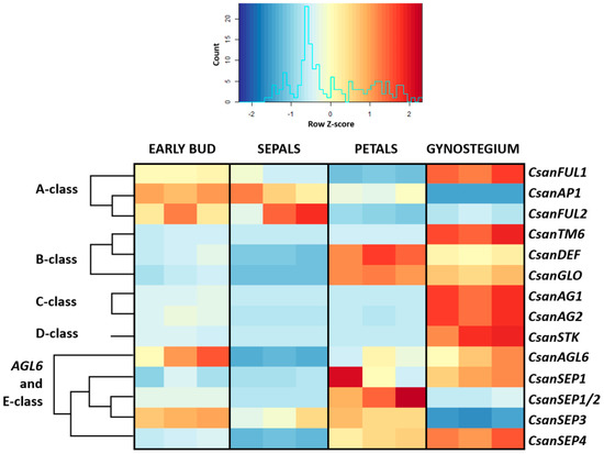 Differential gene expression analyses, as visualized in a heatmap (Figure 6), indicated clear differences in organ specific expression patterns of the 14 different MADS-box gene copies investigated. In early buds, CsanFUL1, CsanAP1, CsanFUL2, CsanAGL6, and CsanSEP3 showed higher expression than all other genes in this developmental phase (Figure 6). Nine genes, i.e., CsanTM6, CsanDEF, CsanGLO, CsanAG1, CsanAG2, CsanSTK, CsanSEP1, CsanSEP1/2, and CsanSEP4, were higher expressed in mature flowers than in early floral buds (Figure 6). Overall, in mature flowers, MADS-box A-class genes were expressed in the gynostegium samples, in the sepals, and in the petals. MADS-box B-class genes showed high expression in the gynostegium and petals. MADS-box C- and D-class genes were highly expressed in the gynostegium and MADS-box E-class genes were expressed in all tissue types, however, with copy specific differences (Figure 6).