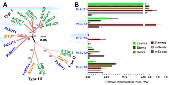 Phylogenetic analysis and tissue-specific expression profile of the P. axillaris SUT/SUC sugar transporters. (A) The 5 SUT/SUC sequences fall into three groups, representing the type I, Type II and Type III members. PaSUTs are shown in blue. Arabidopsis thaliana orthologs are in green: AtSUC1, At1g71880; AtSUC2, At1g22710; AtSUC3, At2g02860; AtSUC4, At1g09960; AtSUC5, AT1G71890; AtSUC6, AT5G43610; AtSUC7, AT1G66570; AtSUC8, AT2G14670; AtSUC9, At5g06170. Solanum lycopersicum orthologs are in orange: SlSUT1, NP_001289830.1; SlSUT2, NP_001234321.2; SlSUT4, NP_001234344.2. Sequence alignment and analysis are conducted using MUSCLE with default parameters, and the phylogenetic tree is constructed with MEGA X version 10.1.8 using the neighbor-joining (NJ) method with 1000 bootstrap replications. The tree is graphed via Figtree version 1.4.4, with bootstrap value greater than 50% shown. The scale bar represents the ammino acid substitution rate per site. (B) Tissue-specific gene expression analysis of the SUT/SUC genes via quantitative real-time PCR. Data are mean of 3 biological replications with the error bars representing SD.