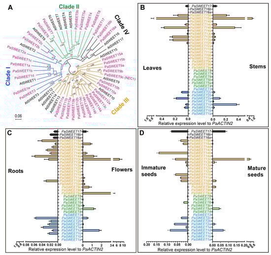 Phylogenetic analysis and tissue-specific expression profile of the P. axillaris SWEET transporters. (A) The 36-gene family of SWEET proteins are grouped into four clades (depicted in colored branch lines) together with the well-annotated Arabidopsis transporters. Sequence alignment and analysis are conducted using MUSCLE with default parameters, and the neighbor-joining (NJ) tree is constructed using MEGA X with 1000 bootstrap replications and visualized via Figtree version 1.4.4, with bootstrap value greater than 50% shown. The scale bar represents the ammino acid substitution rate per site. (B–D) Tissue-specific gene expression analysis of the SWEET genes via quantitative real-time PCR. Data are mean of 3 biological replications with the error bars representing SD.