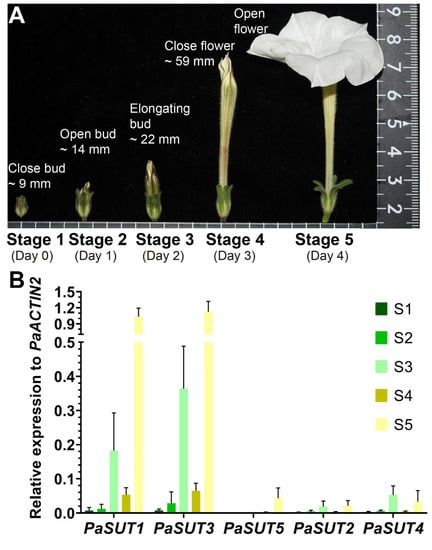 The P. axillaris flower developmental stages (A) and expression profile of the five PaSUT genes (B). Data represent mean and SD of three independent determinations, each is a pooled sample with 2-5 flowers.