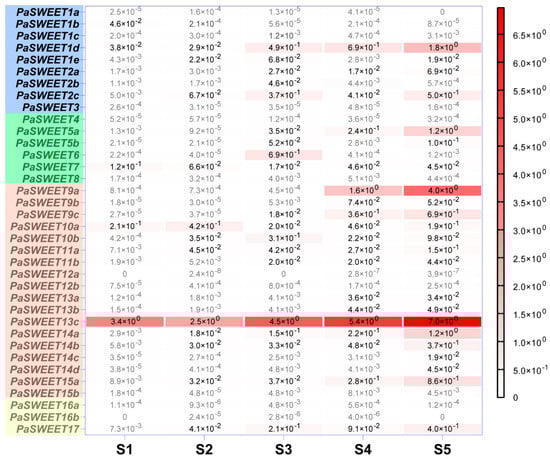 Two of the Clade IV SWEET genes, namely PaSWEET16a and 16b, are hardly expressed in flowers of all stages, while only PaSWEET17 shows detectable yet low level of transcript mainly at later stage of development. Among the six genes in the Clade II, PaSWEET5a is the highest expressed gene which is upregulated in the later stages, being 5- and 6.8-fold increases in stage 5 than in stage 4 and 3, respectively (Figure 4). Interestingly, PaSWEET6 reaches its maximum expression at stage 3 significantly, whereas PaSWEET7 shows a small expression peak in close buds at stage 1. Upregulation of transcription is also evident in Clade 1 SWEET genes, at least for PaSWEET1d and PaSWEET2c-both of which display highest transcript level at stage 5 (Figure 4).
