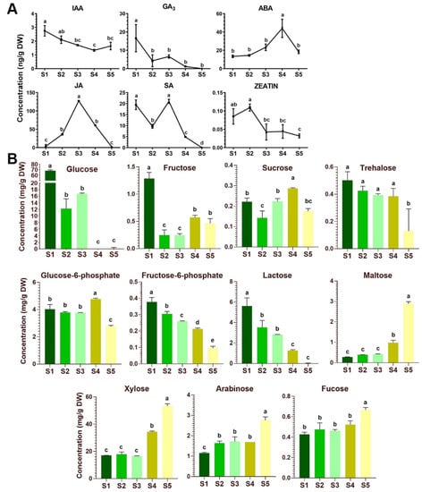 Phytohormone and sugar contents in the 5 stages during P. axillaris flower development. (A) Phytohormone dynamics during the flower development. Data are mean and SD of three independent experiments. (B) Sugar contents in the developmental stages. Date represent mean and SD of three independent experiments. Significant difference between group with variable letters above the line or bar are verified using two-way ANOVA and multiple T-test (p < 0.05) implemented in the Prism software version 7.04.