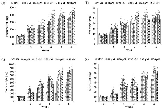Fresh weight and dry weight of P. bullata callus grown on MS medium at different concentrations of (a,b) α-naphthaleneacetic acid (NAA), (c,d) indole-3-butyric acid (IBA), (e,f) indole-3-acetic acid (IAA), (g,h) 2,4-D, (i,j) picloram, and (k,l) dicamba. Data represented as means ± SE. The asterisk (*) represents a significant difference of treated callus with 1-week old callus grown on MS basal media without auxins (MSO) at p ≤ 0.05 Tukey’s range test.