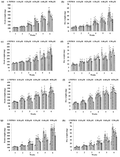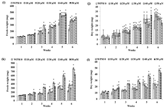 As for WPM media (Figure 2), the highest fresh weight (FW) was recorded in the callus treated with 40 µM dicamba with 771.50 ± 20.86 mg FW after six weeks of culture (Figure 2k) followed by WPM + 40 µM 2,4-D after six weeks of culture (760.67 ± 85.21 mg FW) (Figure 2g), WPM + 20 µM NAA after six weeks of culture (623.67 ± 49.34 mg FW) (Figure 2a), WPM + 10 µM picloram after five weeks of culture (480.33 ± 18.94 mg FW) (Figure 2i), WPM + 20 µM IAA after six weeks of culture (375.33 ± 20.95 mg FW) (Figure 2e), and WPM + 40 µM IBA after six weeks of culture (373.33 ± 32.36 mg FW) (Figure 2c).