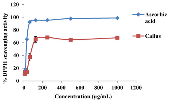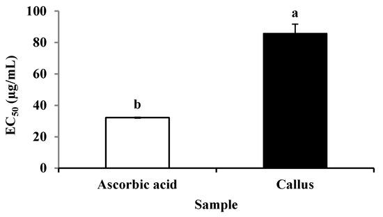 The DPPH scavenging activity was analyzed at different concentrations of ascorbic acid and callus extract (7.81–1000 µg/mL). The DPPH scavenging activity was also expressed as the EC50 value (µg/mL) based on the linear regression of plots of mean percentage of the antioxidant activity against the concentration of the test extracts (μg/mL). The antioxidant activity was also expressed as ascorbic acid equivalent antioxidant capacity (AEAC) using the following formula: [60].