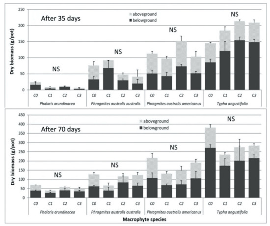 - Costa, M.B.; Tavares, F.V.; Martinez, C.B.; Colares, I.G.; de Martins, C.M.G. Accumulation and effects of copper on aquatic macrophytes Potamogeton pectinatus L.: Potential application to environmental monitoring and phytoremediation. Ecotoxicol. Environ. Saf. 2018, 155, 117–124. [Google Scholar] [CrossRef]
