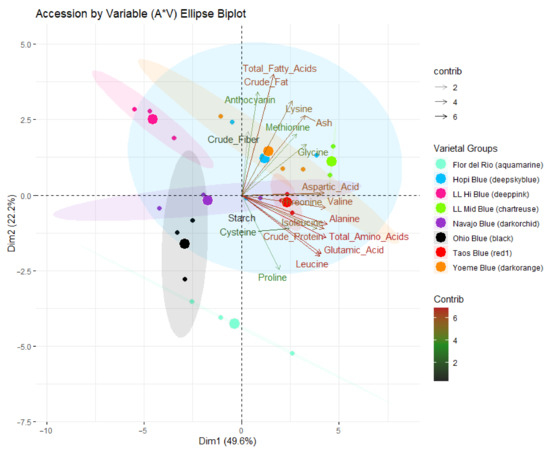 Blue maize accessions were distributed across all quadrants (Figure 1). Los Lunas Mid (ellipse with chartreuse color) was populated in quadrant 1 comprised of positive PC1 and PC2 (Figure 1), and characteristics of this quadrant are high crude fiber, anthocyanin crude fat, total fatty acids and amino acids (especially methionine, glycine and aspartic acid) and low starch. Los Lunas High (ellipse with deep pink color) was populated in quadrant 2, which comprised of a positive quadrant of PC2 and negative quadrant of PC1 and is characterized by low protein and starch whereas and high crude fiber, crude fat, and anthocyanin. Ohio blue (black color) was spread in quadrant 3 and characterized by high levels of starch within the accession, with generally low-fat levels (Figure 1). Hopi blue (ellipse with deep sky blue color) and Yoeme blue accessions (ellipse with dark orange color) were spread in quadrants 1, 2, and 4 (Figure 1). The variation within the Yoeme blue accession is strongly aligned with crude protein and total amino acids, while Hopi blue has many variations in each dimension. Navajo blue (ellipse with dark orchid color) was distributed across all four quadrants; however, the variation is clearly aligned with PC1, which indicates the little variation in fiber and starch, whereas high variation in certain amino acids. Flor del Rio (ellipse with aquamarine color) is distributed across quadrants 3 and 4 and characterized by high starch and low fiber and fat. Variation within the samples is well aligned with crude protein and total amino acids. Taos blue (ellipse with red1 color) is populated across quadrants 1 and 4 and has low within-accession variation, and is close to the average for most traits. The PCA helped to visualize the clustering of compounds, and to some extent, clusters of amino acids based on their biosynthetic pathways were seen. Amino acids from the aspartate (methionine, lysine, and aspartic acid), pyruvate (alanine, valine, and leucine), and glutamate (glutamic acid and proline) families were clustered together. Cysteine and glycine did not cluster well as a biosynthetic family.