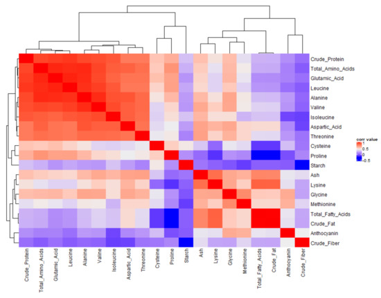 Some of the observed correlations can be explained by a mathematical relationship. Crude protein and total amino acids are essentially the same traits measured by two different methods. This may explain its strong correlation to total amino acids and crude protein. Crude fat and total fatty acids share a similar relationship. All of the amino acids are components of both crude protein and total amino acids, so some degree of correlation is expected. Crude fat and total fatty acids share a similar relationship. Most amino acids were strongly correlated with each other except for proline, and individual amino acids were also strongly correlated with total amino acids except proline, glycine, cysteine, and methionine (Figure 2 and Figure 3, Table S4). Glutamic acid has an important role in nitrogen assimilation and thus plays a role in the synthesis of all amino acids. This may explain its strong correlation to most amino acids and crude protein (Figure 2 and Figure 3, Table S4). Essential amino acids were not strongly correlated with protein with correlations of <0.60 (Figure 2 and Table S4). With regard to the relationship between anthocyanin and other compositional traits, no strong correlation was reported except for methionine (r = 0.79) and a moderate correlation with glycine (r = 0.69) and lysine (r = 0.62) (Figure 2 and Table S4). Similarly, starch had no strong or only a moderate positive correlation, with other components except leucine (r = 0.54); however, negative correlations were observed with total amino acids (r = −0.53), threonine (= −0.51), alanine (r = −0.53), leucine, glutamic acid (r = −0.55), and crude fiber (r = −0.49) (Figure 2 and Table S4). Oil and fatty acids were strongly correlated with ash and lysine only, whereas no significant moderate correlations were observed with other compositional traits (Figure 2 and Table S4). It is clearly noticeable that starch, anthocyanin, crude fiber, and proline were correlated with only a few or no other components and were most independent of other traits and may therefore be most valuable for classifying grain samples (Figure 2 and Figure 3, Table S4).