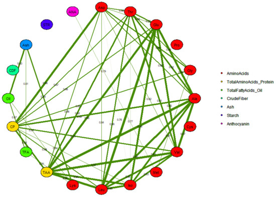 Correlations among grain compositional traits were investigated by a correlation matrix (Figure 2 and Table S4). Associations between traits were also illustrated by a correlation network (Figure 3). Strong correlations with an absolute value > 0.75 were included in the correlation network. In Figure 3, the width of each band represents correlation strength, whereas green colored bands illustrate positive correlations between descriptors. Most compositional traits were strongly correlated with another trait except for starch, anthocyanin, ash, crude fiber, and proline (Figure 3).