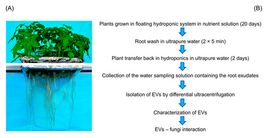 Experimental design used for collection and characterization of small Extracellular Vesicles (EVs) released by tomato roots. (A) Twenty-day-old tomato plants after removal from the nutrient solution and before transfer to ultrapure water for 2 days for the collection of root exudates (B) Schematization of the experimental design for plant growth, root exudate collection and EVs isolation and characterization.