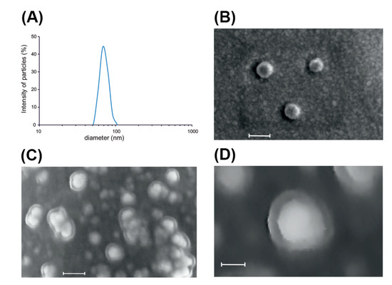 Nanometer-sized biomembrane vesicles have also been isolated from complex food matrices of plant origin, such as homogenized roots of ginger and carrots, and fruit juices of different citrus species and grapes [11,12,13]. It is worth mentioning that vesicles isolated from homogenized plant materials and fruit juices were shown to contain a complex mixture of intra- (transport vesicles, secretory vesicles, etc.) and extracellular vesicles. These new and innovative biomaterials are being exploited in their native forms due to their proven anti-inflammatory, anticancer and tissue regenerative properties as well as their action on the gut microbiome in vitro and in vivo [11,14,15]. Moreover, they can be used as nanovectors for the delivery of bioactive molecules [16].