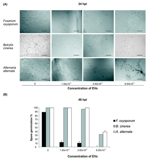 To address this last hypothesis, spores of the tomato soil-borne pathogen Fusarium oxysporum, and of the tomato air-borne pathogens Botrytis cinerea and Alternaria alternata were incubated with tomato root-released EVs. Spore germination of all tested fungi was affected when EVs were added to the substrate (Figure 4A,B). Spore germination of F. oxysporum was the most affected by the presence of EVs in the germination solution, since 48 h post inoculation (hpi) only 12% spores germinated in a solution containing 1.50 × 1010 EVs (Figure 4B). In contrast, at the same EVs concentration, almost 100% spores of A. alternata and B. cinerea germinated, while a strong inhibition was observed only at the highest concentration (6.00 × 1010 EVs, Figure 4B). It is worth noting that, although B. cinerea and A. alternata spore germination at 48 hpi was close to 100% in the presence of up to 3.00 × 1010 EVs (Figure 4B) and that the development of germination tube was progressively inhibited by increasing EVs concentrations, as indicated by the corresponding decrease in tube length at 24 hpi (Figure 4A).