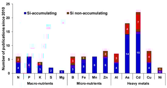 Number of major published articles indicating only the cross-talk between Si and nutritional stress since 2010. For each element, the number inside each bar indicates the number of published work in Si-accumulating (blue bar) or Si-non-accumulating species (red bar).
