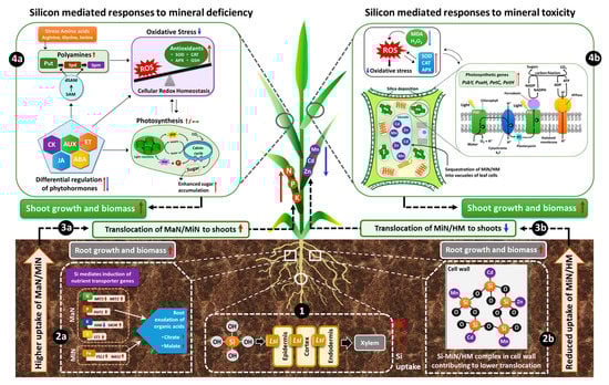 Under nutritional deficiency, Si increases the expression of MaN/MiN transporters in the root and favors the translocation of nutrients to the shoot, where it further modulates metabolic pathways and improves photosynthetic efficiency. However, under MiN or HM toxicity, Si is usually complexed with MiN/HM in the root cell wall and thereby reduces root to shoot translocation of toxic elements, while in shoots Si mitigates toxicity by sequestering MiN/HM into the leaf vacuoles and simultaneously decreases oxidative stress by maintaining redox balance.