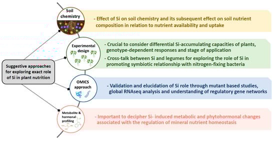 Our review shows a clear role for Si under nutritional stress or heavy metal toxicity. In spite of numerous studies linking Si and MN, the huge gap in this field remains its exact role, which could be divided in the following (Figure 3); (a) soil: It is striking that the impact of Si on soil and its component has been scarcely investigated. This is crucial due to the importance of soil and its interaction with MN for future sustainable agriculture. There is no doubt that Si chemistry is complex due to certain soil influencing factors such as pH, texture, and organic matter [,], which need to be further explored experimentally. Supplying soil with Si might bring an array of changes in soil physico-chemistry and may influence soil nutrient composition. This is basically due to alkalinisation of soil pH because of the type of silicates used in different experiments and the fact that even the freely available form of Si monosilicic acid might be soluble up to a certain concentration []. (b) Experimental design: obviously, there is no strong consensus and unique protocol to use Si experimentally in different studies. One of the crucial points dealing with Si nutrition is classification of crop plants in regard to their ability to accumulate Si []. For this purpose, the different responses of Si-accumulating and non-accumulating species must be carefully considered when exposed to individual mineral stress, to build a general conclusion. Notably, as proposed by Putra et al. [] an extensive investigation needs to be considered on the cross-talk between Si and legumes to decipher how Si promotes the symbiotic relationship with nitrogen-fixing bacteria. This body of Si is crucial in the future works as numerous studies showed the positive interactive effect of Si and plant growth promoting rhizobacteria on plant growth particularly under unfavorable environmental conditions []. In addition, among the same species, research on genotype-dependent response to Si nutrition need to be considered. Moreover, the optimum dose of Si as well as the stage-dependent application of Si seems an important criteria to build a precise conclusion. Although the effect of Si is more pronounced under stress conditions, a close look at the studies linking Si with MN, and Si’s role under stress-free conditions, is important. For instance, Jang et al. [] observed a dose-dependent regulation of N and Ca2+ in hydroponically grown rice treated with Si, suggesting a possible role for Si even under control conditions. (c) Omic approaches: One of the key aspects of Si in various reports is its role in modulating the uptake and translocation of MN, which is difficult to explain due to the lack of understanding of a direct role for Si in plants. Although several candidate genes impacted by Si were shown, further confirmatory tests with mutants of these genes have not been reported and therefore the functionality of the genes in response to Si nutrient remains to be demonstrated. The majority of the gene expression analysis is based on up- or down-regulation in their transcript, and failed to concretely interpret if Si is directly involved in these changes or they are the consequence of the applied stresses. Therefore, this feature of Si needs also to be investigated using uptake labeling experiments, which are crucial in linking Si and its role in uptake/translocation of minerals. In the meantime, RNAseq analysis can open a new window and global understanding in the regulation of gene networks by Si supplement under mineral nutrient deficiencies considering Si-accumulating and non-accumulating species and genotype effects. (d) Metabolite and hormonal profiling; metabolites and hormones are both vital for regulation of plant nutrition homeostasis. During the last few years, our research studies provided some evidence in this regard, indicating the impact of Si nutrition under K [], S [,] and Mg [] deficiencies. Moreover, the role of Si in metabolic changes under arsenic [] as well as the change in amino acid levels in rice has been previously reported []. In this context, the lack of sufficient results led to debated interpretation, and thus this cross-talk needs to be further experimentally investigated.