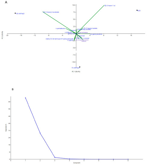 Scatter plot (A) and Scree plot (B) of the principal component analysis (PCA) of the volatile organic compounds (VOCs) at different gradient of salinity.