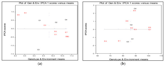In the AMMI biplot the genotype and environment main effects for plant height are presented on the x-axis, while the IPCA1 (Interaction Principal Component Axis 1) scores are on the y-axis (Figure 2b). The vertical line is the grand mean for the trait plant height and the horizontal line (y-ordinate) represents the IPCA1 value of zero. Small distance environmental points from the origin (zero point) indicate that E2, E3, E6 and E7 were assessed as the most favorable to achieve a stable reaction to plant height. Environments E4, E5, E1 and E8 had the highest interaction values, which determines them to be the least suitable for the stable establishment of the plant height of wheat.