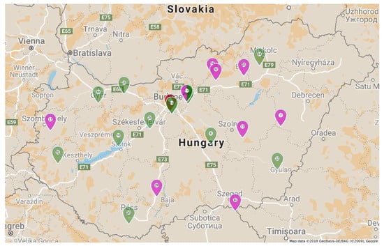 Location of collected samples showing tulip breaking syndrome in Hungary. Sample numbers are placed on markers. Red marker indicates Rembrandt tulip-breaking virus (ReTBV), green Tulip breaking virus (TBV), pink Lily mottle virus (LMoV) infection. Bicolor marker represents tulip population with TBV and LMoV infection.
