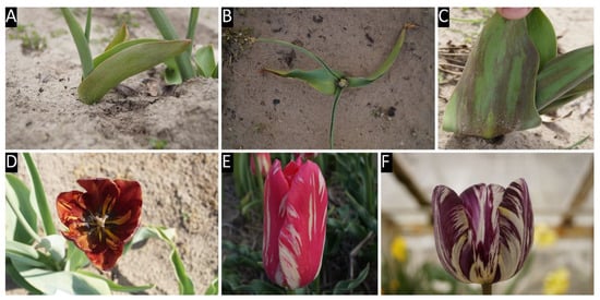 Tulips, as ornamental plants, have first been described as early as 1576 by Carolus Clusius [1]. Tulips are bulbous ornamental plants belonging to the genus Tulipa [2,3]. Currently 102 accepted taxa [4] with more than 6700 cultivars belong to the genus [5]. The vast majority of the cultivars are the hybrids of Tulipa gesneriana [2,3,6]. Tulips are vegetatively propagated under open field conditions. Only breeders and plant enthusiasts grow tulips from seed. The juvenile phase is around six years [7,8,9], and it takes about 25 years to bring a new cultivar to the market [8,9]. The vegetative reproduction, to have a uniform and identical crop, and the relatively low vegetative propagation rate, makes this crop susceptible to a variety of diseases, especially to viruses. Tulip breaking is economically the most important viral disease of modern-day tulip growing. In the early years of the 17th century, tulips with broken flowers were highly appreciated, they became a symbol of status [7,10]. Later, these broken tulips were called Rembrandt tulips, and became the second known, but the first well documented record of viral disease of a plant [11]. Tulip breaking syndrome is characterized by irregular flame and feather like patterns in the flowers and line pattern and mosaic on the foliage [12]. Symptoms occur in a short period during the growing season, usually before or during flowering, occasionally after flowering. Newly infected tulips show symptoms only in the next growing season [12,13,14]. In spring when infected plants emerge the leaves stand stiffly upright, become crooked or cigar shaped, and are often smaller than normal. Some cultivars show purple-burgundy or light and dark green striping on the abaxial side and near the leaf margins [13,15]. These symptoms are transient, they fade or become masked as the growing season progresses. At the beginning of flowering or after flowering leaves develop the characteristic striping or ringspot mosaic [13,15,16]. Infected plants go dormant sooner than healthy ones [13]. The pattern, the type of color change, and the contrast in the breaking depends on the cultivar [13,15]. In the case of white, cream, and yellow flowers breaking causes glossy flecks on the petals, which is hard to spot in the field. In the case of cultivars with green stigma infected ones became lighter, and originally light green ones turn white. Red flowered plants may have a red blush on their green styles. In all cases, the color change intensifies as the flowering progresses [13].