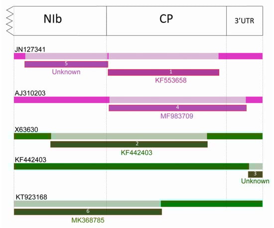 Schematic display of predicted recombination events on the analyzed region of potyvirus genome map. First dashed line indicates the beginning of the cloned fragment (GNNSGQP motif). Second dashed line indicates the NIb/CP cleavage site, the third line the stop codon of the polyprotein and the last represents the end of the 3’ untranslated region (3′ UTR) preceding the polyA tail. Arabic numbers in the bars indicate the order in which RDP characterized the event. Accession numbers above the bars (black numbers) indicate the recombinant sequence. Accession numbers and “Unknown” under the number of the recombination event represents the minor parents. Schematic display of sequences are generated by the program, bars have been consistently colored according to the virus species. Pink-purple bars (recombination events 1, 4, and 5) indicate LMoV, green bars (recombination event 2, 3, and 6) indicate TBV sequences. The breakpoints are always mentioned according to the position in the alignments.