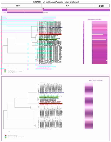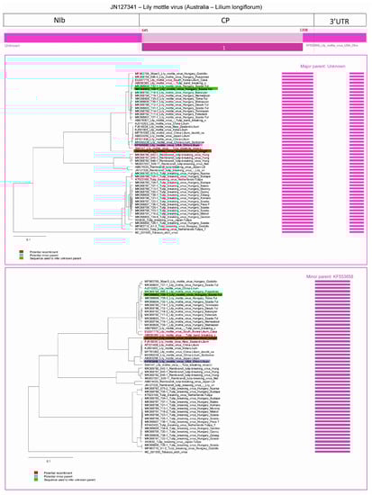 Three potential recombination events were predicted in the case of LMoV. In an Australian strain (acc. #: JN127341) isolated from Lilium longiflorum two recombination events were predicted and one recombination was predicted in a Lilium strain of LMoV (acc. #: AJ310203).