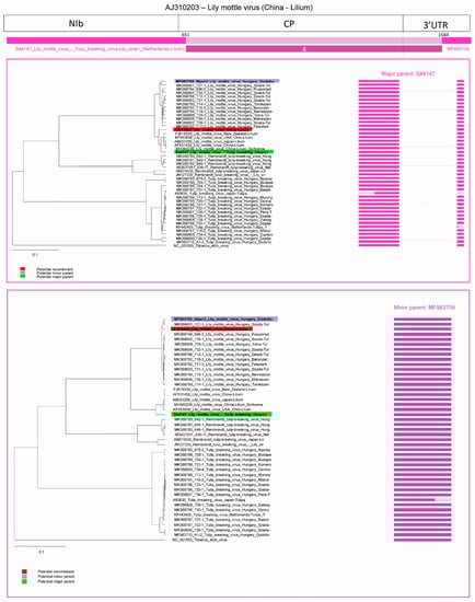 In the 4th predicted recombination event, an LMoV strain from China (acc. #: AJ310203, subgroup I) was identified. The major parent was a LMoV strain described as TBV-lily strain [30] (S44147, subgroup II) and minor parent was an LMoV strain identified in this study (acc. #: MF983709, subgroup I). The first breakpoint is at position 651 located in the amino-terminal part of the CP and the second breakpoint is at position 1584 in the 3′ end non-coding region. Graphic representation of the event and NJ trees of both parents indicated that the major parent of the recombinant grouped with the subgroup II isolates, while the fragment corresponding to the minor parent grouped with the subgroup I isolates (Figure 8). This clearly demonstrated that the recombinant resulted from a recombination between the two subgroups.