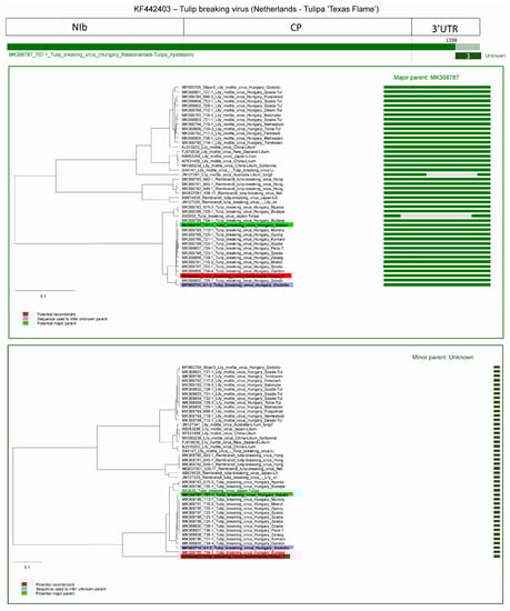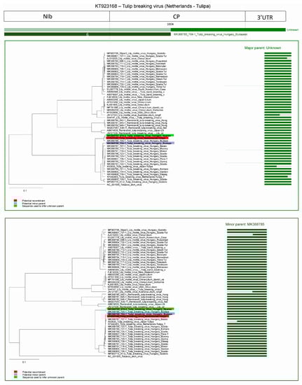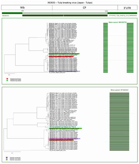Three possible recombinants were predicted in the case of TBV; one in a TBV strain (currently accepted as Tulip mosaic virus) from Japan (acc. #: X63630) and two from the Netherlands (acc. #: KF440423 and KT923168).