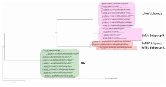 Tulip mosaic virus (TulMV, acc. #: X63630, RefSeq: NC_043425) [18] was identified as a separate species in 2005 [26], but the reference sequence presented in the ICTV database shows 98.78% identity with acc. # KF442403 and 96.96% identity with acc. # MH886517, both are TBV isolates.