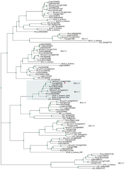 Phylogenetic tree constructed by the maximum-likelihood method based on amino acid sequences of BELLs from Arabidopsis thaliana, rice Oryza sativa and legumes: Medicago truncatula, Pisum sativum, Lotus japonicus, and Phaseolus vulgaris. Green dots indicate support more than 70 based on 1000 bootstrap replicates. Red asterisk indicates the gene of interest.