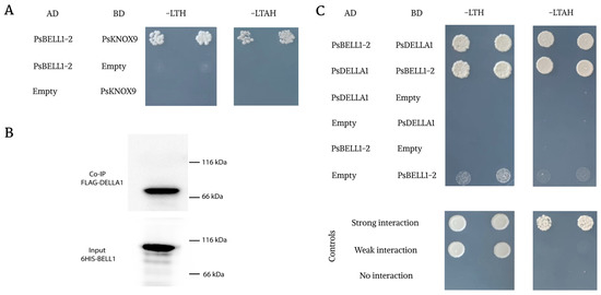Analysis of the interaction between PsBELL1-2, PsKNOX9 and PsBELL1-2, PsDELLA1 using different approaches. Yeast two-hybrid assays between PsBELL1-2 and PsKNOX9 (A), PsBELL1-2 and PsDELLA1 (C). Co-immunoprecipitation (Co-IP) between PsDELLA1-FLAG and PsBELL1-2 (B). For the yeast two-hybrid assays, serial dilutions optical density at 600 nm (OD600) = 0.1 and 0.05 were used. Interaction was tested on a selective medium lacking leucine, tryptophan, and histidine (SD-LTH) and medium additionally lacking adenine (SC-LTAH). Yeast growth on indicated mediums shows the protein interaction. As controls, a few pairs of vectors (pEXP32/Krev1 and pEXP22/RalGDS-wild type, pEXP22/RalGDS-m1, and pEXP22/RalGDS-m2) suggested by the manufacturer (Thermo Fisher Scientific, Waltham, MA, USA) were used for strong, weak, and not detectable interactions.