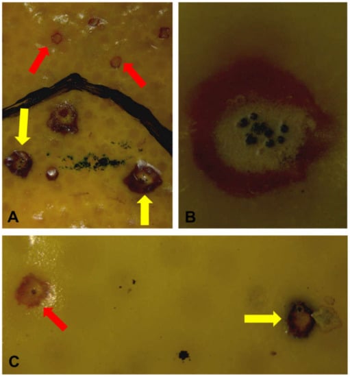 Citrus black spot (CBS) lesions on fruit. (A) Newly developed and old CBS lesions on a ‘Midknight’ Valencia orange fruit subjected to a complete packhouse treatment regime consisting of pre-packhouse drench, chlorine wash, fungicide dips and wax application. (B) New CBS lesion with pycnidia on untreated ‘Eureka’ lemon fruit. (C) New and old CBS lesions on untreated ‘Eureka’ lemon fruit. New and old CBS lesions are shown by red and yellow arrows, respectively.