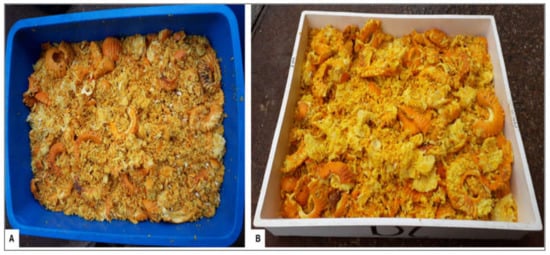 Citrus pulp generated from processing ‘Midknight’ Valencia oranges. (A) Pulp in a container and left overnight after fruit processing. (B) Pulp spread flat in an open tray and exposed to natural conditions.