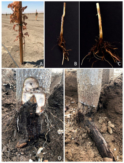 Symptoms in pistachio rootstocks associated with Macrophomina phaseolina; (A) wilting and death of unbudded University of California Berkeley I (UCBI) pistachio rootstocks; (B,C) associated crown rot symptom; (D,E) pistachio tree showing crown rot and black discoloration.