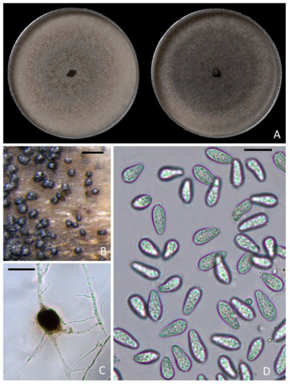 Morphological characteristics of Macrophomina phaseolina; (A) colonies on potato dextrose agar after 10 days of incubation at 25 ± 1 °C in darkness; (B,C) microsclerotia on pistachio wood and close up on a microsclerotium produced on water agar; (D) conidia produced from mature pycnidia forming on pistachio leaf agar medium. Scale bar in B = 300 μm; in C = 60 μm; and in D = 20 μm.