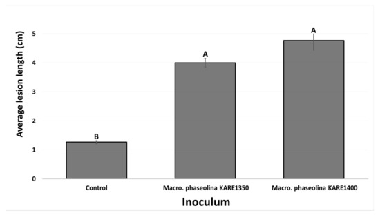Average lesion lengths (cm) on pistachio clonal UCBI rootstocks 10 months after inoculation with mycelial plugs of Macrophomina phaseolina isolates KARE1350 and KARE1400 (September 2016 inoculations). Columns with different letters indicate treatment means that are significantly different (p = 0.0005).