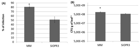 SiOPR3 transgenic plants have increased resistance to Pseudomonas syringae. Four-week-old tomato plants cv. Moneymaker (MM) and SiOPR3 were inoculated with Pst, as described in Materials and Methods. Seventy-two hours after inoculation, the disease rate was evaluated by visual observation to determine the percentage of dark brown spots on the leaf surface (A) and by recounting the bacterial populations through plating in agar-King’s B medium (B). The data show the average values ± standard error (n = 20). The asterisks represent statistically significant differences (p < 0.05; least-significant difference test).