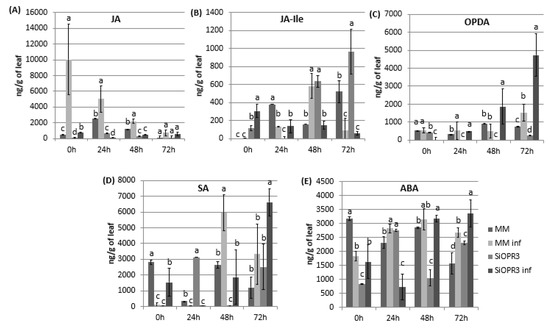 Hormone levels in MM and SiOPR3 plants upon Pst infection. Leaves were collected at 0, 24, 48 and 72 hpi and JA (A), JA-Ile (B), cis-(+)-12-oxo-phytodienoic acid (OPDA) (C), salicylic acid (SA) (D), and abscisic acid (ABA) (E) levels were determined by ultra-performance liquid chromatography (UPLC)-mass spectrometry. Data show the average of three independent experiments of a pool of 10 plants per experiment ± SE. Different letters indicate statistically significant differences between treatments at the same time point (p < 0.05; least-significant difference test).