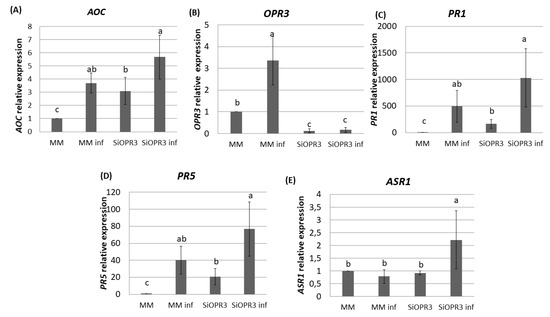 Gene expression profile of plant defense pathways in MM and SiOPR3 plants upon Pst infection. MM and SiOPR3 plants were grown and inoculated as described in Materials and Methods. The expression of the AOC (A), OPR3 (B), PR1 (C), PR5 (D), and ASR1 (E) genes were analyzed in cDNA from MM and SiOPR3 plants at 72 h post-inoculation. The results were normalized to the EF1α gene expression measured in the same samples. The results show the average values of three independent experiments with similar results ± standard error (n = 3).