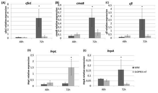 On the contrary, the expression of the hrpL gene, which is a transcription sigma factor that activates the expression of the Hrp/Hrc type III secretion system, and several effector proteins are higher in silenced plants. The fact that the expression of this gene is not correlated with the other virulence factors analyzed has been observed in previous studies using hexanoic acid to prevent the bacterial growth [34]. This suggests that HrpL could regulate other responses to stress, to ensure the survival of the bacteria.