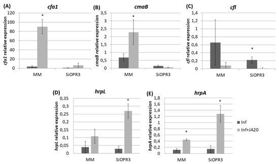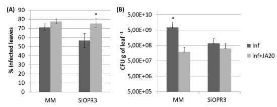 On the other hand, when we analyzed the genes that are involved in other virulence mechanisms, such as hrpL and hrpA, we observed that their expression is increased in plants that are treated with JA and this increase was higher in SiOPR3 plants. The importance of type III secretion system and the effectors in the establishment of infection was previously demonstrated [23,24]. Moreover, Zhao et al. suggested the relation of the JA pathways and type III secretion system [39]. In this work, they showed that the type III secretion system appears to influence the induction of some JA/wound response genes, but not the contrary, as observed in the present study.