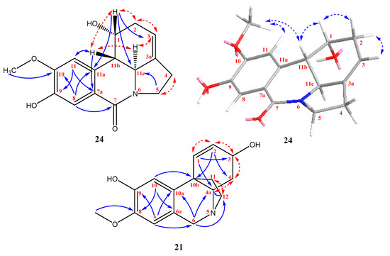 Figure 2. The constitution of 21; the constitution of 24 and its relative configuration. The key gCOSY (red dashed arrows), gHMBCAD (blue arrows), and NOESY (blue dashed arrows) correlations are marked.