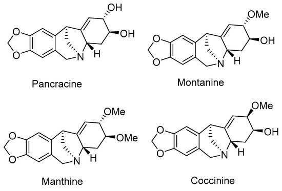 Pancracine (22) is a montanine type of AA, in the same group as montanine, coccinine, and manthine. This structural type of AA seems to be a promising souce of compounds in the search for new anticancer drugs. They are characterized by a 5,11-methanomorphantridine ring system, the only differencies being the substitutions and configuration at C-2 and C-3 centers (Figure 3) [40]. Some of these compounds have been screened against different cancerous cells [12,41].