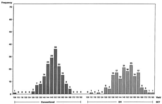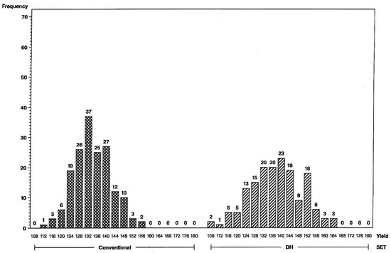 Higher genetic variance for DH lines results in a change in the shape of distributions, with fewer maize hybrids in the middle and more in the tails of the DH-hybrid distributions. Expected response from first-year yield trials is, therefore, greater for DH-line hybrids than for conventional S2-line hybrids.
