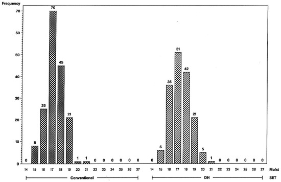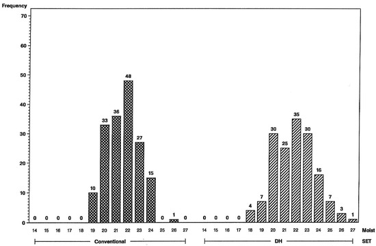 Figure 3. Frequency distributions for maize hybrid grain moisture in percent (on x-axis) using the L inbred tester, conventional S2 line-hybrids on the left and DH line-hybrids on the right. Numbers of hybrids are above the bars.