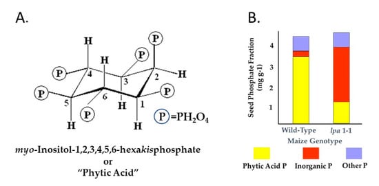 Phytic acid (myo-inositol-1,2,3,4,5,6-hexakisphospate; Figure 1A) is the storage form of phosphorus (P) in seeds, typically representing from 75 ± 10% of seed total P [1]. Following synthesis during seed development, it accumulates and is deposited as mixed “phytate” or “phytin” salts primarily of potassium (K) and magnesium (Mg). These salts may also contain iron (Fe) and zinc (Zn) and other mineral cations. Prior to 1980 (the year I began my PhD studies of genetic and environmental factors impacting soybean phytic acid), there was no “Mendelian” genetics of seed phytic acid; there were no known mutations or variant alleles that perturbed seed phytic acid synthesis or accumulation. The first low phytic acid (lpa) mutants of any crop species, maize (Zea mays L.) low phytic acid 1-1 (Zmlpa1-1) and Zmlpa2-1, were isolated around 1990 in my then fairly new USDA-ARS (Agricultural Research Servic) lab [2]. Homozygosity for these first two maize mutations reduced seed phytic acid (myo-inositol hexakisphosphate) by 50% to 70% while having little discernible effect on seed total phosphorus (P) (illustrated in Figure 1B for maize lpa1-1). Isolation of maize lpa1-1 and lpa2-1 was followed in my lab and many others with the isolation of mutations in a third maize locus [3], lpa mutants in barley (Hordeum vulgare L.), rice (Oryza sativa L.), wheat (Triticum aestivum L.), soybean [Glycine max (L.) Merr.], common bean (Phaseolus vulgaris L.), in several additional crops and model systems such as Arabidopsis thaliana (L. (Heynh)), and increasingly via genetic engineering in a number of crops [4,5,6]. In seed homozygous for most but not all lpa mutations or genotypes, reductions in phytic acid P are largely matched by increases in inorganic P, with little or no change in seed total P. In some cases (such as maize lpa2) reductions in phytic acid P result in increased inorganic P and increases in other inositol phosphates such as myoinositol tris-, tetrakis, or pentakisphosphate, but the seed total P remains similar to wild-type (data not shown).