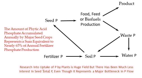 Since P was relatively inexpensive in 1990, valuating the low-phytate trait in terms of “feed P equivalents” created several hurdles to development and production. Rather than using the well-proven “penetration pricing” strategy, where new products are initially sold at relatively low prices to capture market share [39,40], industry participants at that time wanted to attach a “technology surcharge” to HAP hybrid seed, in my opinion, a short-sighted business strategy. The problem was the “feed P value” of the first lpa types, based on market prices for P in the early 1990s, was not sufficient to accommodate this “technology surcharge”. But what if the price of P for use in feeds and fertilizers dramatically increased over the next 10 to 20 years? What if the price of P will continue to increase or experience price spikes? It takes a minimum of ten but often many more years to go from the initial development of a new biotech trait to its widespread marketing [41]. Should not that early decision been based on future projections of P prices? Today the increasing cost and potential future scarcity of rock phosphate for use in fertilizer P and feed P production is changing views of the importance of seed phytic acid. By 2015, the cost of rock phosphate had roughly tripled since 1990, so that net available P in a low-phytate line where half the phytate is converted to available P would represent $15 billion (US) (Figure 3B, right). Also, using this same estimate of the dollar value of seed P, if the 20% to 30% reduction in seed total P trait of barley lpa1-1 or the rice SPDT knock-outs were engineered into all major grain and legume seed crops, that could potentially represent a savings of up to$ 4.5 billion (US), annually.