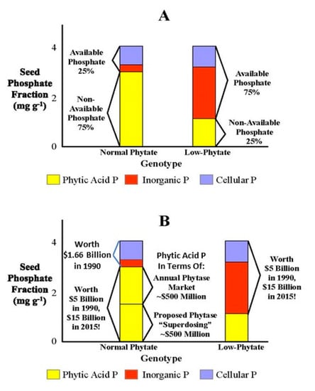 First let us take the example of how the lpa trait was initially viewed and evaluated by an Ag biotech company when it was first available for use in crop breeding in the early 1990s. The main interest in seed phytic acid in the agricultural industry in the U.S. and Europe was and largely remains its role as the major P fraction in grains and legumes destined for use in poultry and swine feeds. Since phytic acid P is “non-available P” whereas essentially all other forms of P are “available P” (Figure 3A; reviewed in [6]), the low-phytate trait in maize was initially referred to as “High Available P” or “HAP” corn [38]. The approach initially used by this Ag biotech company to determine the value of the lpa trait was in terms of the dollar value of the increase in available P, using then-current (early 1990s) P prices. For example, using the market cost for rock phosphate (https://www.indexmundi.com/commodities/?commodity=rock-phosphate&months=300); if an lpa allele converts half of the phytic acid P in seeds from “non-available P” to “available P”, in 1990 the available P in a low-phytate line would represent ~$5 billion (US) (Figure 3B, right), as compared with $1.66 billion (US) for the available P in the “normal phytate” line (Figure 3B, left).