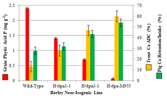 The power of lpa near-isogenic lines as an experimental tool in human and animal research is that one can produce test foods or feeds with very accurately known levels of seed-derived endogenous phytic acid that are stable and vary from wild-type levels in a step-wise fashion, through moderate reductions to lines which produce seed with a near-absence of phytic acid. No additional experimental (“artificial”) manipulations are needed. As a result, when using these lines, the impact of dietary phytic acid on some aspect of nutrition can be assayed more quantitatively, and with a higher degree of accuracy, than is possible using other experimental approaches. Furthermore, any difference in nutritional outcomes observed between wild-type versus lpa near-isogenic lines can be attributed to the single-gene allelic difference conditioning the trait. As an illustration, consider two nutrition studies, one with pigs (Sus scrofa domesticus (Erxleben)) and one with trout (Oncorhynchus mykiss (Walbaum)), that were conducted with a set of four barley near-isogneic lines (Figure 4) [44,45]. These four lines produce seed with either wild-type levels of seed phytic acid (cv. Harrington), or seed with step-wise reductions in phytic acid: a ~40% reduction in Hvlpa1-1, a ~70% reduction in Hvlpa3-1, and a >95% reduction in HvlpaM955. This provides a nicely linear set of feed phytic acid treatments that in both studies revealed a highly linear negative correlation between grain phytic acid level and calcium bioavailability (“% apparent digestibility coefficient” or (ADC) in the trout study and “% retention/intake” in the pig study).